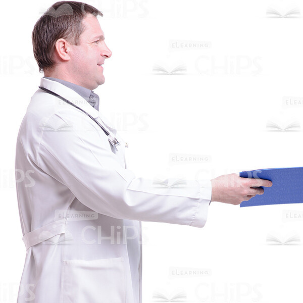High-quality cutout image of middle-aged doctor is standing sideways. He puts weight on his left leg. Valentin is extending a folder with his right hand and is smiling to a person he is talking with. The doctor looks happy. The cut out photo would be an excellent addition to any type of web or print related project. The availability of the transparent background allows you just to drop the image over a slide, without any further processing. It’s available in few formats such as M, L and XL, to fit the needs of any customer. Feel free to look through our huge cutout people library and pick any photo(s) you need.