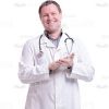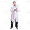 High-quality cutout image of a middle-aged man. He is a doctor. We have a full-length photo. He is standing full face. On his neck he has the stethoscope. His eyes directed at the camera. He is happily smiling and applauding. The man is dressed in the white the doctor’s smock. Under his doctor’s smock he has gray shirt and black pants and on his feet he has the black shoes. Man has dark hair. This handsome cutout character provides you more opportunities to create an interesting visual story.