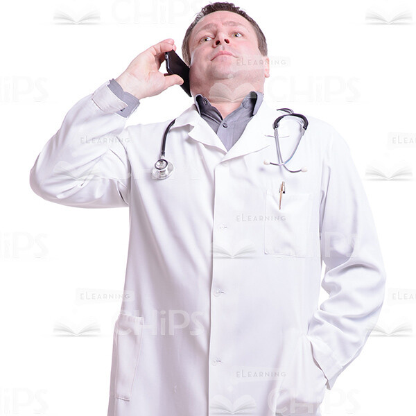 High-quality cutout image of a middle-aged man. He is a doctor. We have a full-length photo. He is standing full face. On his neck he has the stethoscope. His eyes are not directed at the camera. He is serious. His is bowed out and raised his shoulders. He has his handy in the right hand. He is calling someone. He does not know what to say. He is holding his left hand in the pocket of his doctor’s smock. The man is dressed in the white the doctor’s smock. Under his doctor’s smock he has gray shirt and black pants and on his feet he has the black shoes. Man has dark hair. This handsome cutout character provides you more opportunities to create an interesting visual story.
