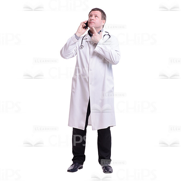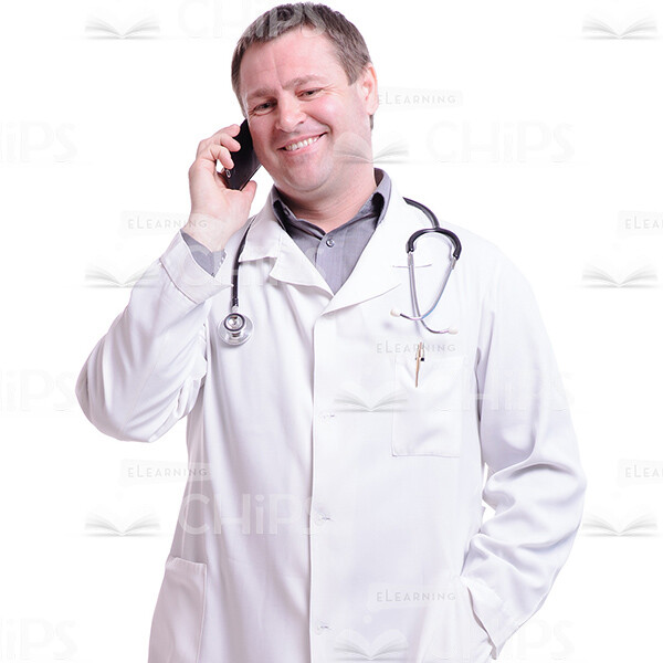 High-quality cutout image of a middle-aged man. He is a doctor. We have a full-length photo. He is standing full face. On his neck he has the stethoscope. His eyes are not directed at the camera. He is looking down. He has his handy in the right hand. He is listening someone. He is laughing. He has a good news. He is holding his left hand in the pocket of his doctor’s smock. The man is dressed in the white the doctor’s smock. Under his doctor’s smock he has gray shirt and black pants and on his feet he has the black shoes. Man has dark hair. This handsome cutout character provides you more opportunities to create an interesting visual story.