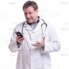 High-quality cutout image of a middle-aged man. He is a doctor. We have a full-length photo. He is standing full face. On his neck he has the stethoscope. His eyes are not directed at the camera. He is looking at his handy. He has his handy in the right hand. His handy is not working. He is angry telling something to the handy. The man is dressed in the white the doctor’s smock. Under his doctor’s smock he has gray shirt and black pants and on his feet he has the black shoes. Man has dark hair. This handsome cutout character provides you more opportunities to create an interesting visual story.