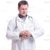High-quality cutout image of a middle-aged man. He is a doctor. We have a full-length photo. He is standing full face. On his neck he has the stethoscope. His eyes are not directed at the camera. He is looking at his wrist-watch.. The man is dressed in the white the doctor’s smock. Under his doctor’s smock he has gray shirt and black pants and on his feet he has the black shoes. Man has dark hair. This handsome cutout character provides you more opportunities to create an interesting visual story.