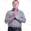 High-quality cutout image of a middle-aged man. We have a full-length photo. He is standing full face. His eyes are not directed at the camera. He is begging He is holding his hands in front of him in a begging gesture. The man is dressed in the gray shirt and black pants with the black belt and on his feet he has the black shoes. Man has dark hair. This handsome cutout character provides you more opportunities to create an interesting visual story.