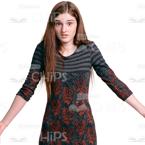 High-quality cutout photo of a young lady spreads her arms to the sides. She looks puzzled and discouraged. Her eyes are directed at the camera. Wearing a long casual sweater dress. The photo might be useful for any kind of web and print related project (e-learning course, presentation, marketing, etc.). Availability of the transparent background allows just to drop it into the project slide, without the need for further processing. Every cutout people image is presented in four sizes: S, M, L and XL. Feel free to browse through our huge cut out photo library and pick any item(s) you really like.