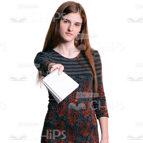 Cutout Image Of Woman Hodling Notebook With Outstretched Hand