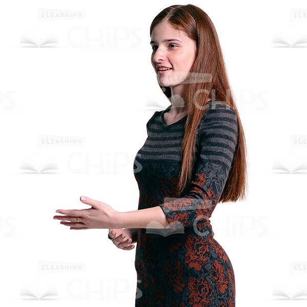 Attentive Young Girl Talking Cutout Image. High-quality cutout image of a young girl standing sideways and talking to somebody. Wearing casual women sweater dress. Her eyes are directed to the potential interlocutor. The girl seems to be very friendly. This photo will perfectly illustrate any presentation. Could be used in various e-learning modules. The whole pack include a variety of poses and emotions. All photos were taken from multiple angles and available with transparent backgrounds. This will save you from routine work during e-course development.