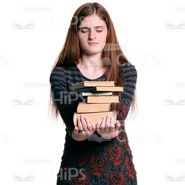 Full-sized cutout image of a nice young girl holding few books with both hands. Her eyes are directed on them. She looks unhappy with the amount of books she holds. A pretty female character wears an informal long sweater dress. This photo would be useful to illustrate an eye-catching character in e-learning courses and presentations. It is represented in four different formats: S, M, L and XL. All cutout people photos come with the transparent background, so all you need is to pick the suitable image(s) and insert it into the project. Feel free to look through our huge cutout people library. We’ve collected lots of attractive people pictures, especially for both novice and e-learning professionals.