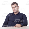 Cutout picture of young presentable man, sitting at the desk. Looks focused and concentrated. He put his left hand on table. Image can be used to display an attentive listener. Dressed in dark blue shirt. This cutout image will perfectly illustrate working situations in your e-course. It is available in four different variations. All of them have transparent backgrounds that help you to create the most effective e-learning presentation. Just choose the right one and drop it into your e-learning project. You can also look through the other cutout people images and choose the most suitable for your project.