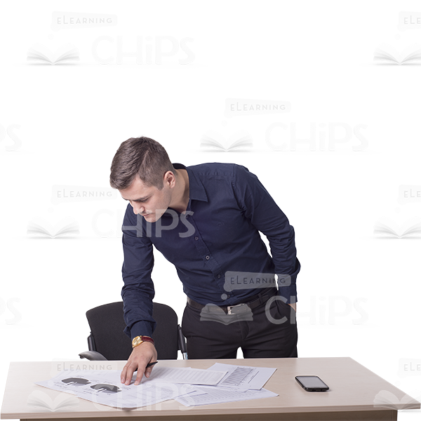 High-quality cutout picture of young businessman standing near the table and looking at the papers. Looks concentrated and thoughtful. He is holding his left hand in his trouser pocket. Dressed in a dark blue shirt and black trousers. This image is perfect for creating interactive training course. With the help of it your e-course will be more easily to grasp. The transparent background allows you to insert a picture into the project without any further photo treatment. You can also see more photos of this model and select the most suitable among all.