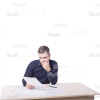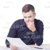 A thoughtful young man is sitting at the table and reading business papers. He looks extremely focused and careful. He holds a paper in his right hand. This high-quality cutout photo can be used to illustrate a working process. Dressed in a dark blue shirt. This image is perfect for creating interactive training course. With the help of it your e-course will be more easily to grasp. The transparent background allows you to insert a picture into the project without any further photo treatment. You can also see more photos of this model and select the most suitable among all.