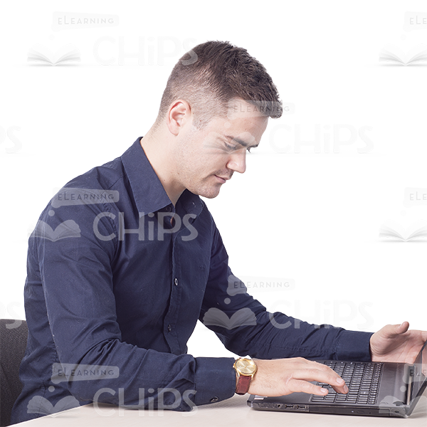High quality cutout photo of pleased young man siting behind desk and working on laptop. His eyes are focused on laptop’s keyboard. Looks satisfied with his work. Can be used as typical office manager. Will perfectly illustrate the person sitting in workplace. Diagonal angle allows you to cover the specific learning situation. There are lots of photos of the same model shot from multiple angles with various postures and facial expressions. All cutout people images are presented with transparent backgrounds
