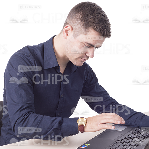 High quality cutout photo of fascinating young man siting behind the desk and typing text on his laptop. His eyes are focused on keyboard. Looks completely immersed in work. Can be used as typical office manager. Will perfectly illustrate the person sitting in workplace. Diagonal angle allows you to cover the specific learning situation. There are lots of photos of the same model shot from multiple angles with various postures and facial expressions. All cutout people images are presented with transparent backgrounds