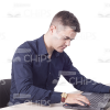 High quality cutout photo of fascinating young man siting behind the desk and typing on laptop. His eyes are focused on keyboard. Looks completely immersed in his work. Can be used as typical office manager. Will perfectly illustrate the person sitting in workplace. Diagonal angle allows you to cover the specific learning situation. There are lots of photos of the same model shot from multiple angles with various postures and facial expressions. All cutout people images are presented with transparent backgrounds