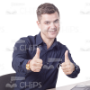 High quality cutout image of happy young businessman siting behind the desk and showing thumbs up. His eyes are looking directly in camera. It seems that he’s completely satisfied with his work. Diagonal angle allows you to cover the specific learning situation and to visualize your project in different ways creating stunning e-course or e-learning presentation. There are lots of photos of the same model shot from multiple angles with various postures and facial expressions. All cutout people images are presented with transparent backgrounds