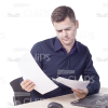 High quality cutout image of frowning young businessman siting behind the desk and examining some business documents. Will perfectly illustrate the person focused on some creative process. Looks completely engaged in work. Diagonal angle allows you to cover the specific learning situation and to visualize your project in different ways creating stunning e-course or e-learning presentation. There are lots of photos of the same model shot from multiple angles with various postures and facial expressions. All cutout people images are presented with transparent backgrounds.