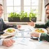 - Appearance: European, young woman, young men, male, female, lady, businessman, businesswoman, having lunch, at restaurant, lunch time, discussing affairs, negotiating;