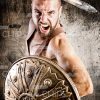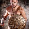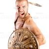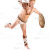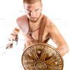 Brave Gladiator Stock Photo Pack. It consists of 16 high-quality stock photos of a warlike young man dressed like a gladiator. His postures and facial expressions look absolutely natural. A man is holding a sword and a shield. The photo pack would be useful for creating e-learning projects, presentations, advertisings, etc.