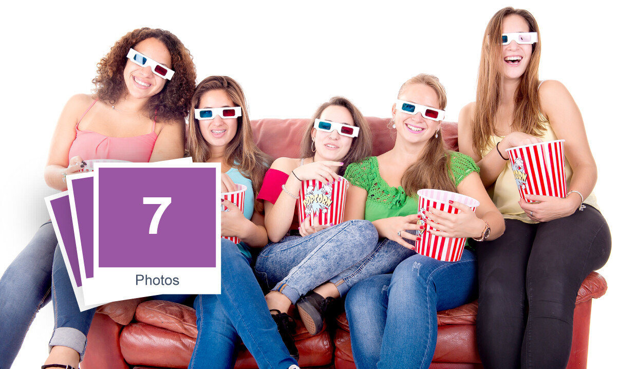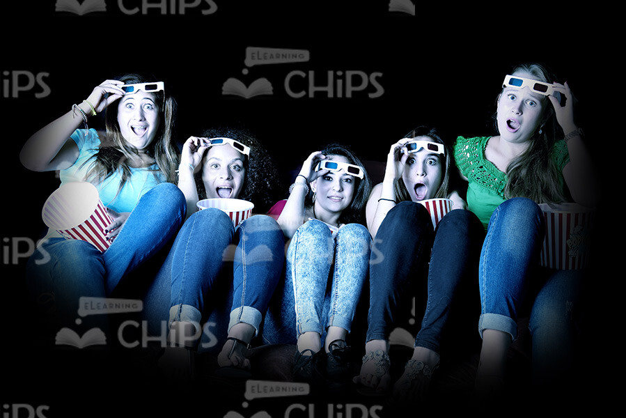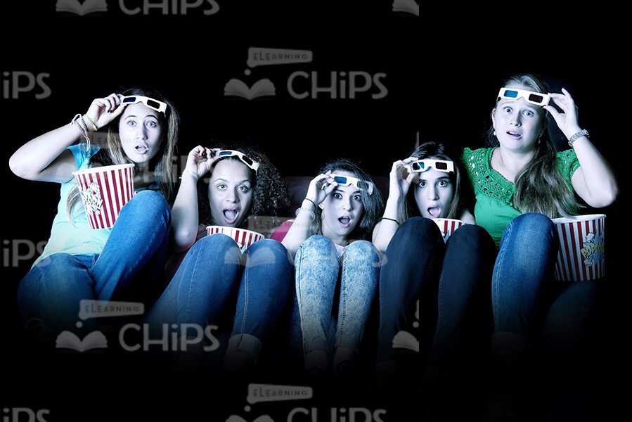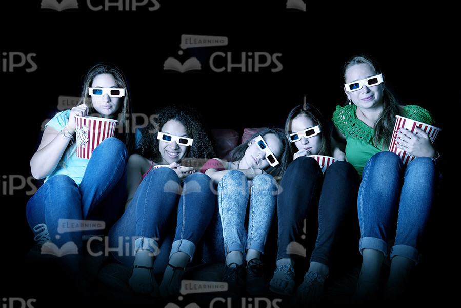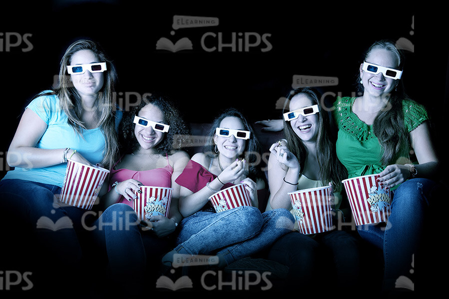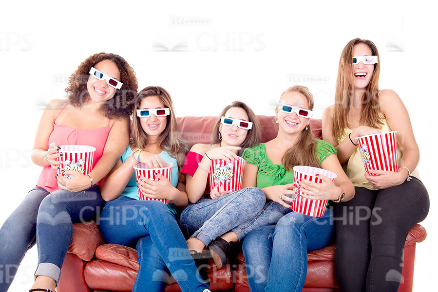 Girls Watching Movie Together Stock Photo Pack contains 7 high-quality images shooted by a professional photographer. Several cute teenage girls are sitting on the sofa and watching the movie in 3D glasses. Each of them is holding a bucket of popcorn and eating it.