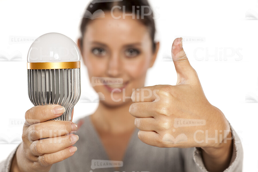 - Appearance: European, Caucasian, female, young woman, lady, girl, handsome, nice, good-looking, attractive, cute, glad, pretty, beautiful, close up, smiling, happy, pleased, satisfied, outstretched hand, holding bulb, with led light bulb, gesturing, thumb up;