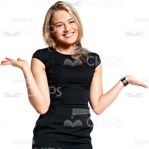 Full-sized cutout picture of a happy young lady throwing hands up. She looks happy and satisfied. Wearing black formal dress. The photo can be used to illustrate a handsome female business person in any kind of web-design project (e learning course, promotion, presentation, etc.). It’s available in few different sizes such as M, L and XL. Feel free to choose the size that fully meets your requirements. The cut out people photos put over the transparent background are the most convenient graphic content for illustrating the life-size characters.
