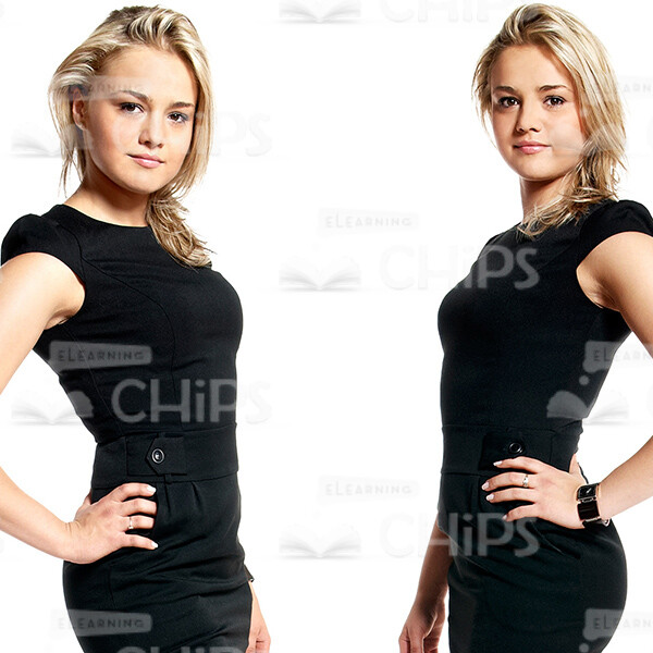 A pretty young female model is standing sideways while posing for the camera. She is represented in two different poses on a single image. A lady looks focused and confident. Her eyes are directed at the camera. The cut out image would be an excellent addition to any kind of web-design project such as e-learning course, marketing message, advertising, etc. It is represented with the transparent background, so all you need is just to insert a photo over the project slide. The picture is available is few different sizes (M, L and XL) to fit the needs of any customer. Just choose the appropriate size and start creating your own visual story.