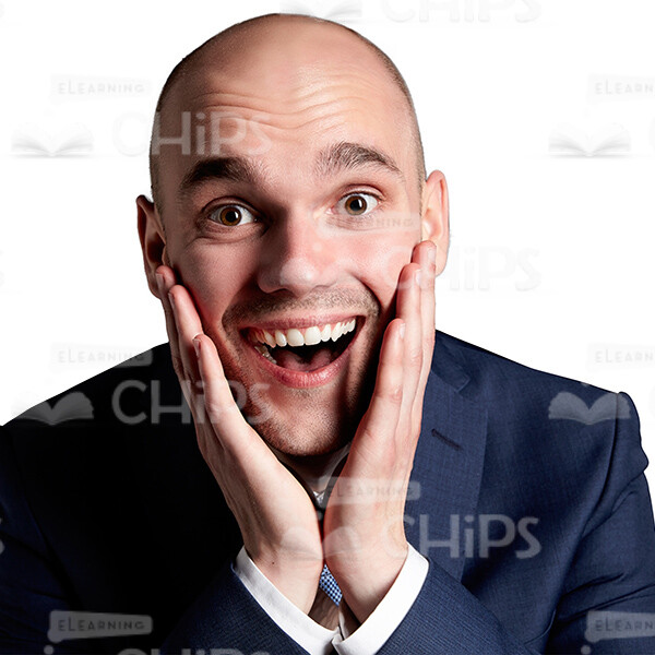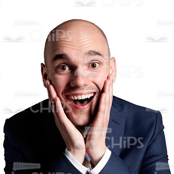 High-quality cutout picture of an excited businessman holding both hands on his cheeks. Looks like that he is surprised with something. Man’s eyes are directed at the camera. This attractive cut out person’s portrait can be used to illustrate a business mentor, tutor or course narrator in any kind of e-learning project. The photo is available in few different sizes to fit the needs of each customer. The presence of a transparent background makes adding the image on a slide easy and convenient. Feel free to pick any of our people cut outs you need to create an amazing educational project.