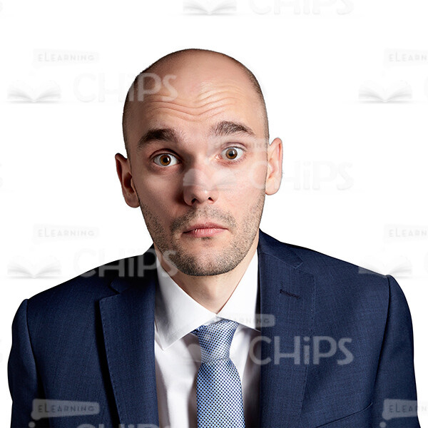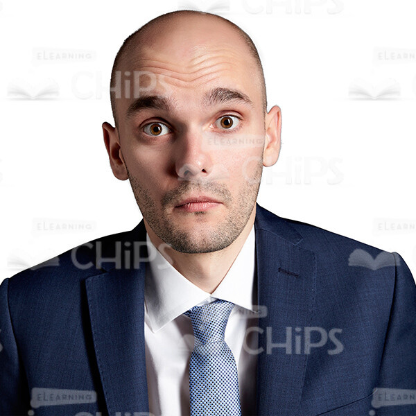 High-quality cutout photo of a discouraged businessman focusing his eyes on a camera. Looks like that he is surprised with something. The close-up portrait can be used to illustrate a teacher, business mentor or course narrator in any kind of educational project. It would be a great addition to e-learning courses, presentations, marketing messages, etc.