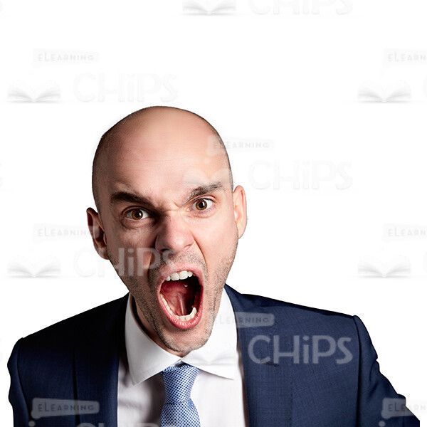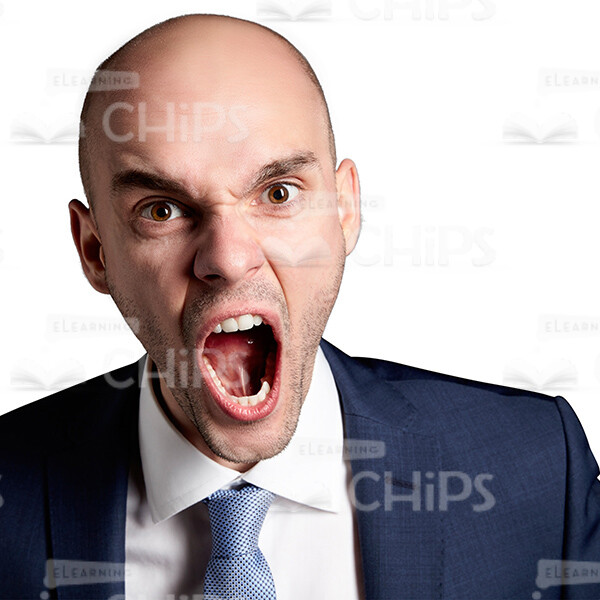 High-quality cutout image of an excited businessman screaming loudly. Looks like that he is displeased with something. The close-up portrait can be used to illustrate a teacher, business mentor or course narrator in any kind of educational project. It would be a great addition to e-learning courses, presentations, marketing messages, etc.