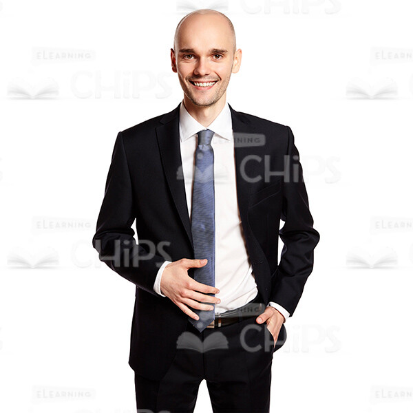 Full-resolution cutout image of handsome young businessman in a formal suit is standing upright. He is holding his blue tie with the right hand and the other hand he put into the pocket of the trousers. The young man is relaxed and looks friendly. He is looking at the camera and is smiling with his mouth and eyes. Handsome man is wearing a black formal suit, white shirt and a blue tie. The cutout image can be used to illustrate a handsome character in any kind of web and print related projects. The photo is available in few different sizes to fit the needs of each customer. The presence of a transparent background makes adding the image on a slide easy and convenient. Feel free to pick any of our people cut outs you need to create an amazing educational project.