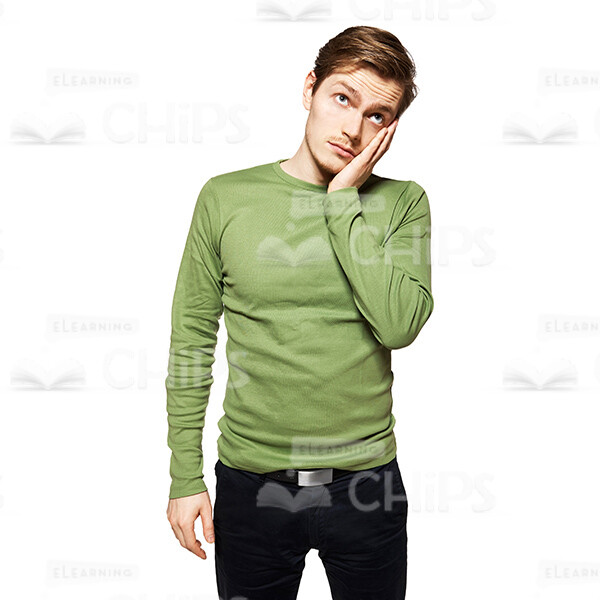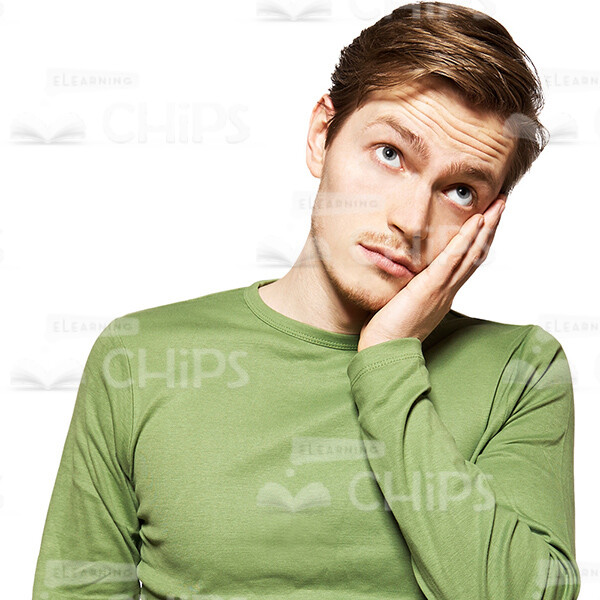 High-quality cutout photo of a young man is standing upright and looking up and propping his cheek with the hand. He looks bored and disinterested. The man is tired of something and doesn’t want to hear it any more. The guy looks very elegant and attractive, thin light green jumper is cut on the body. He has a short haircut. The cutout image can be used to illustrate a handsome character in any kind of web and print related projects. The photo is available in few different sizes to fit the needs of each customer. The presence of a transparent background makes adding the image on a slide easy and convenient. Feel free to pick any of our people cut outs you need to create an amazing educational project.