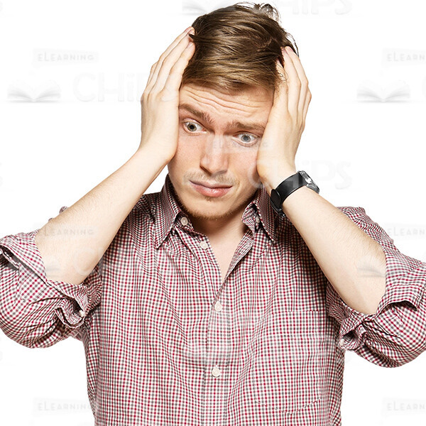 Full-sized cutout picture of a young man is standing upright and holding his head in his hands. He is looking down. The young man is very upset with something and he can’t handle it. He is dressed in casual red and white plaid shirt. This attractive cut out person’s portrait can be used to illustrate a business mentor, tutor or course narrator in any kind of e-learning project. The availability of a transparent background provides more opportunities for creating e-learning courses, presentations, promotion messages, etc. The photo is presented in several formats such as M, L, and in the full-resolution – XL. Just choose the size you need and start to create your own visual story.