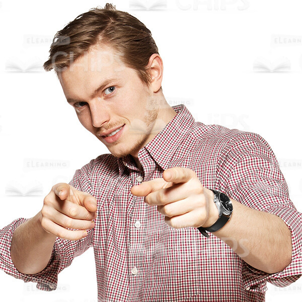 Full-resolution picture of a friendly man. He seems to be in a good mood. He looks like flirting to somebody. He is pointing with his fingers to the camera.