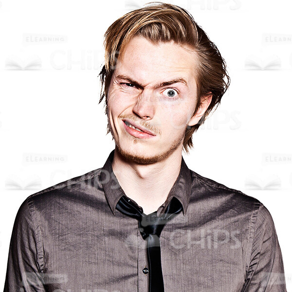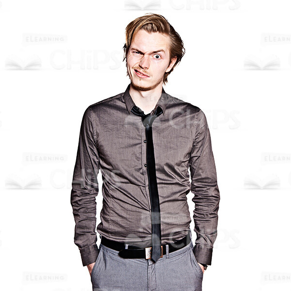 Cutout picture of a surprised man. He holds both hands in his pockets while looks directly at the camera. It seems that a guy is slightly discouraged with something.