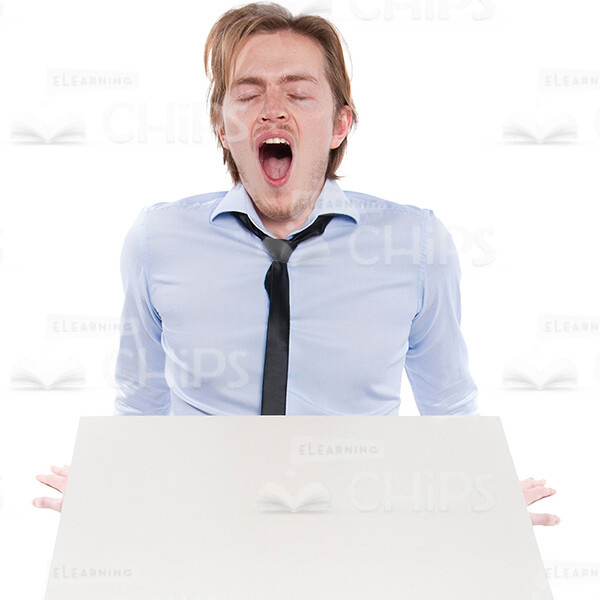- Appearance: European, young man, handsome, business, office, formal wear, tired, sitting on the floor, at the table, white, yawning, opened mouth;