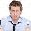 Cutout Picture of Sad Young Man Holding Fork and Knife