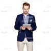 High-quality cutout image of handsome young man is standing upright and holding a tablet in his hands. He is reading something on the tablet. He looks suspecting or surprised. The attractive guy is wearing an elegant outfit – dark blue business suit, blue and white plaid shirt and white trousers. His fair hair is nicely coiffed. He has mustaches. The cutout image can be used to illustrate a handsome character in any kind of web and print related projects. The photo is available in few different sizes to fit the needs of each customer. The presence of a transparent background makes adding the image on a slide easy and convenient. Feel free to pick any of our people cut outs you need to create an amazing educational project.