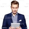 Cutout Picture of Astonished Young Man in Dark Blue Suit Reading Something on Tablet