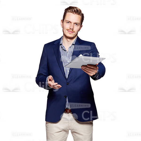 High-quality cutout image of handsome young man is standing upright. His head is slightly tilted to the left. He is extending the tablet to somebody and is looking at the camera. The other hand is open and also reached at the camera. The young man looks pleased and even happy. The young man looks very elegant and respectable in his denim blue jacket and white trousers. White hanky combines with white and blue plaid shirt and trousers. His fair hair is nicely coiffed. He has mustaches. The cutout image can be used to illustrate a handsome character in any kind of web and print related projects. The photo is available in few different sizes to fit the needs of each customer. The presence of a transparent background makes adding the image on a slide easy and convenient. Feel free to pick any of our people cut outs you need to create an amazing educational project.