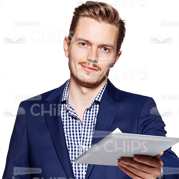 Cutout Image of Handsome Young Man in Dark Blue Suit Tucking Extending the Tablet