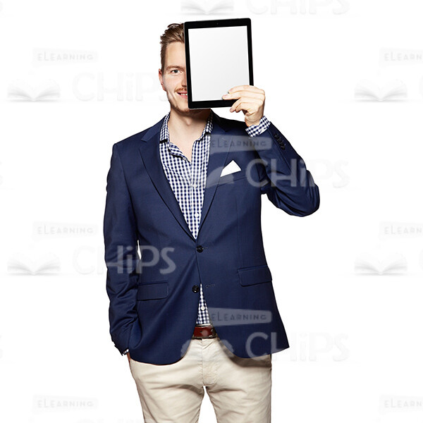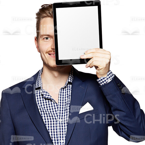 Cutout Photo of a Smiling Young Man in Dark Blue Suit Hiding Half of the Face behind the Tablet