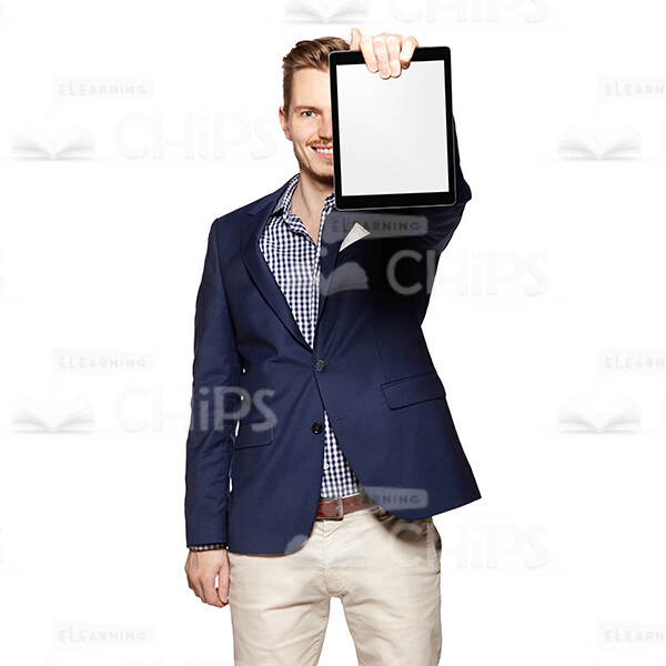 High quality cutout photo of smiling young man with tablet in left hand. Wearing beige pants with brown belt and blue jacket with plaid shirt. He is looking strait to the camera.