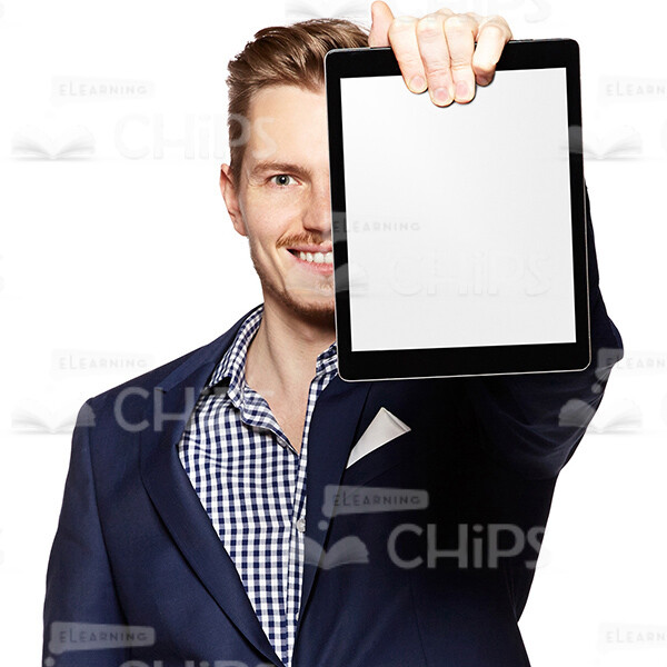 - Appearance: European, young man, guy, adult, male, good-looking, handsome, smiling, emotional, happy, with tablet, in blue jacket;