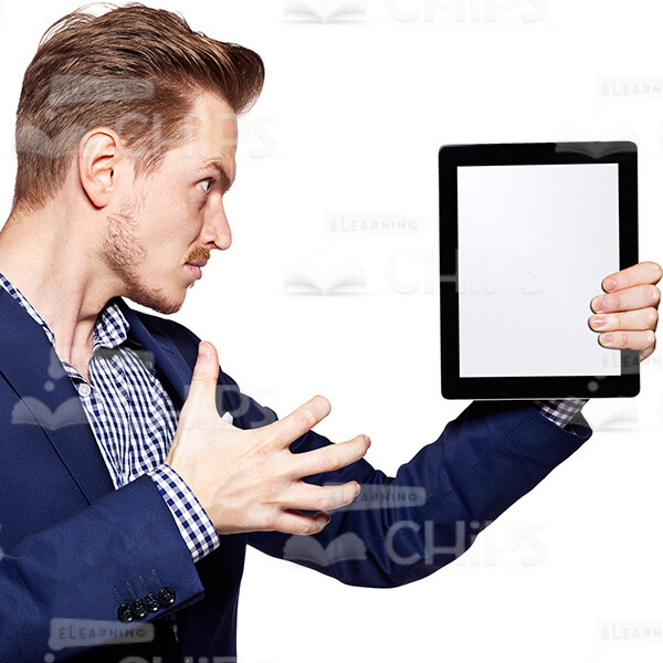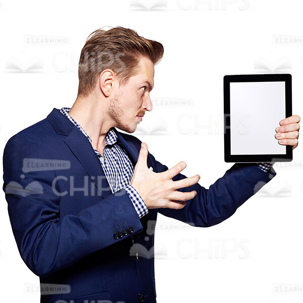 High-quality cutout image of a good-looking young man wearing classic clothes. He is standing with the profile view. He is serious. He is angry. His mouth is closed. He pursed his lips. He is standing with left raised hand and presenting the tablet. His right arm is raised in the direction of the tabled. The fingers of that hand are half bent and aggressively tensed. His eyes are directed at the tablet. He is dressed in blue jacket and blue-white checked shirt. Man has dark eyes and blond hair. This handsome cutout character provides you more opportunities to create a interesting visual story.