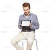 High-quality cutout image of a good-looking young man wearing classic clothes. He is sitting on a chair; with both hands he is holding and presenting the tablet. His eyes are directed at the camera. He has sly and playful look. He is smiling. He is dressed in the light trousers with the brown belt and blue-white checked shirt. Man has dark eyes and blond hair. This handsome cutout character provides you more opportunities to create an interesting visual story.