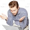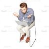 High-quality cutout image of a good-looking young man wearing classic clothes. He is sitting on a toll chair. He has laptop on his knees. He spread out both hands. He is at a loss. He is confused. He is leaned over the laptop, but he is attentively looking at the camera. He is dressed in the light trousers with the brown belt and blue-white checked shirt. Man has blond hair. This handsome cutout character provides you more opportunities to create an interesting visual story.