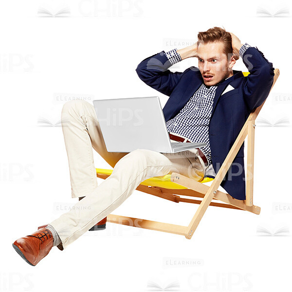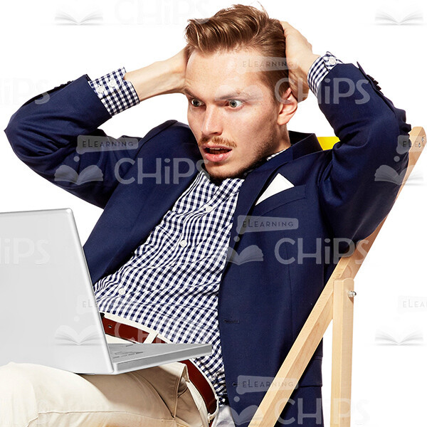 High-quality cutout image of a dumbfounded young man working on laptop. He looks open-eyed and discouraged. A handsome cutout character sitting on the lounge chair provides you more opportunities to create a fascinating visual story. The cutout photo would be useful for any kind of web-design project such as elearning course, presentation, promotion, etc. It’s represented in few variations: M, L and XL. Just choose any size that you need and start to create your own stunned e-learning course.