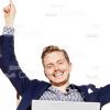 - Appearance: European, young man, guy, adult, male, short hair, stylish haircut, businessman, attractive, good-looking, nice, handsome, with laptop, using laptop, holding laptop on lap, working, throwing hands up, raising arms, happy, smiling, cheerful, successful, pleased, satisfied, gesture, gesturing, rejoicing;
