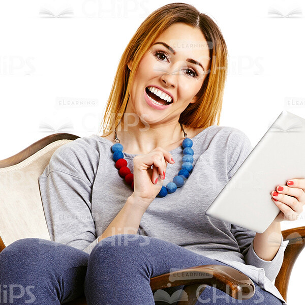 Cutout Image Of Happy Woman Sitting And Using Tablet
