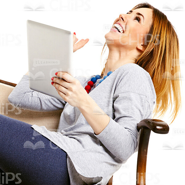 High-quality cutout picture of an excited young woman sitting on a lounge chair while laughing. She’s holding a tablet with a left hand. Her eyes are directed upwards. The photo would be useful for creating web-design projects (e learning courses, presentations, marketing messages, etc.). It’s available in few different sizes such as M, L, and the full-resolution – XL. Feel free to pick any of them that meets your requirements. We’ve collected lots of cutout people images with dozens of poses and facial expressions to fit the needs of every e-learning developer.