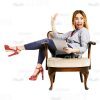 High-quality cutout image of the surprised young woman sitting half-turned on a lounge chair. Her eyes are directed at the camera. Her mouth and eyes are widely open. She is holding a tablet with a left hand; it looks like she has found some interesting for her information. She is looking happy. Her right arm is bent at the elbow and raised in a greetings gesture. Her legs are thrown over the arm of the chair. Her right leg is bent at the knee, the left is stretched out. The woman has dark eyes and her long ombre colored hair gradually blends from brown to blond. She is dressed in the blue jeans with the grey pullover, red-blue bead-necklace, red in white speck high-heeled shoes.